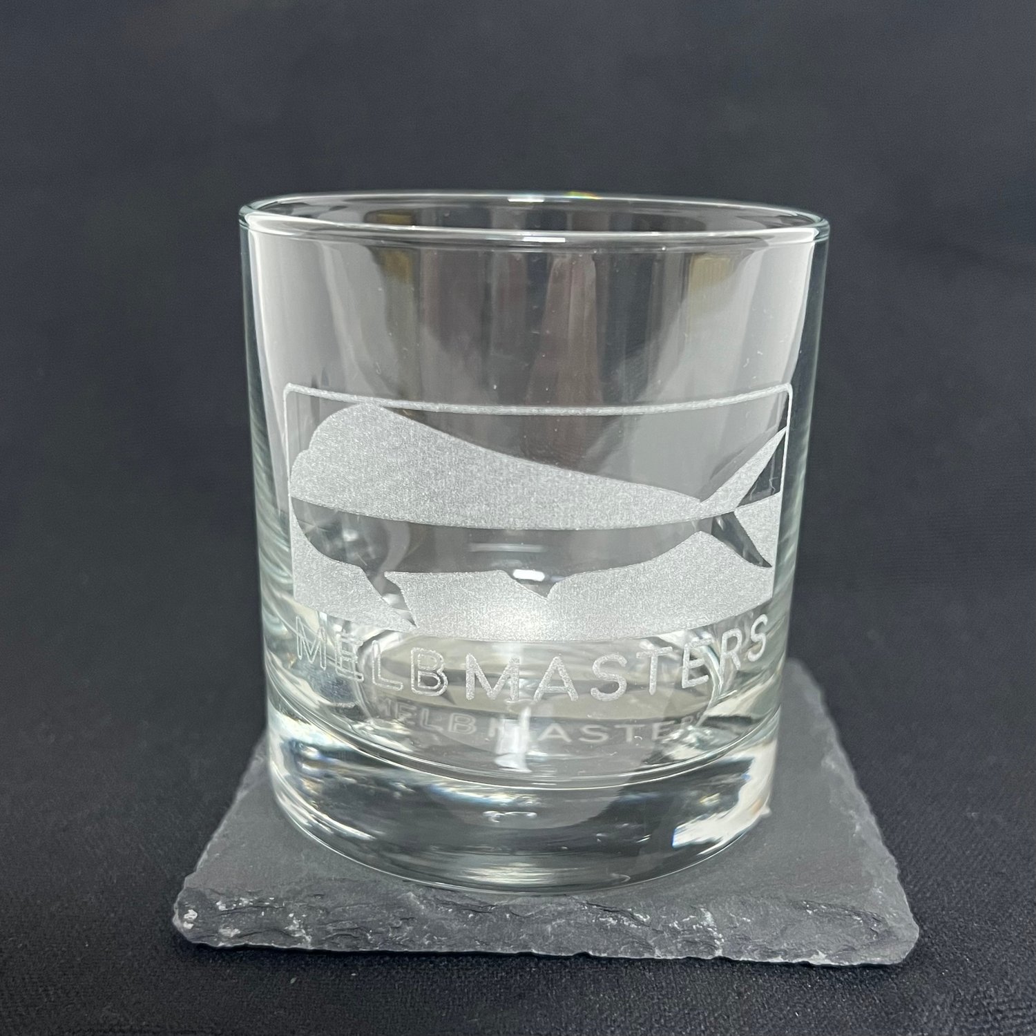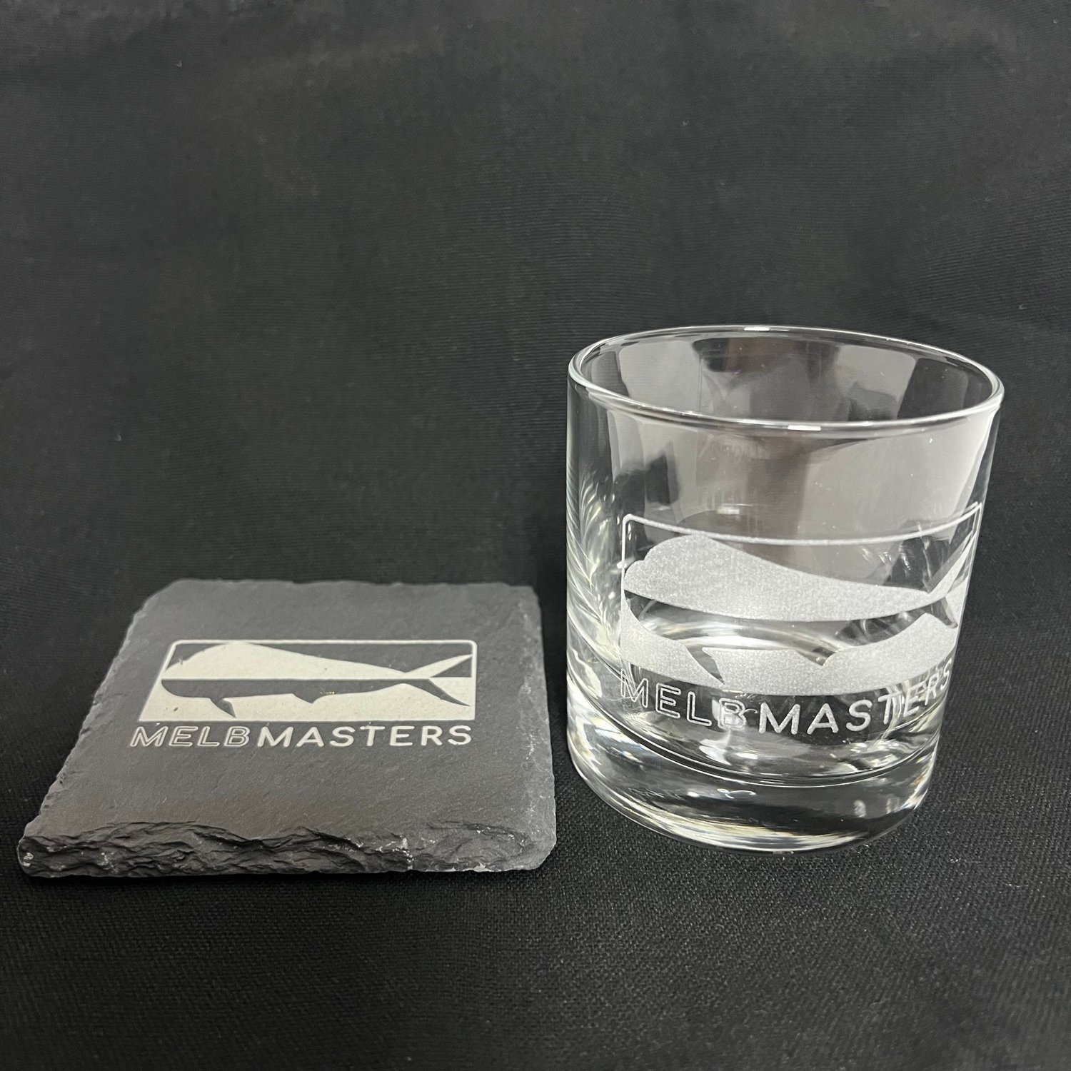 Laser-Engraved MELB Masters 10oz Whiskey Glass with Matching Engraved Slate Coaster